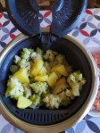 2) Faire cuire les pommes de terre à l’eau ou à la vapeur . Au Thermomix couper les pommes de terre en cubes de 2-3 cm , les mettre dans le panier cuisson. Remplir le bol d’eau de 600g d’eau . Faire cuire 30mn /température Varoma/ vitesse 1. Vider l’eau du bol , y verser les pommes de terre la crème fraîche et le fond de légumes , Mélanger 10sec / Vitesse 3.